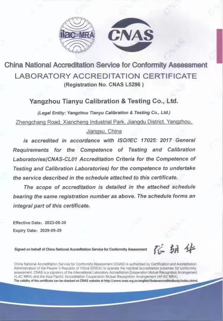 2011年11月正式獲取中國合格評定國家認可委員會認可(授權),注冊號:CNAS L5296。